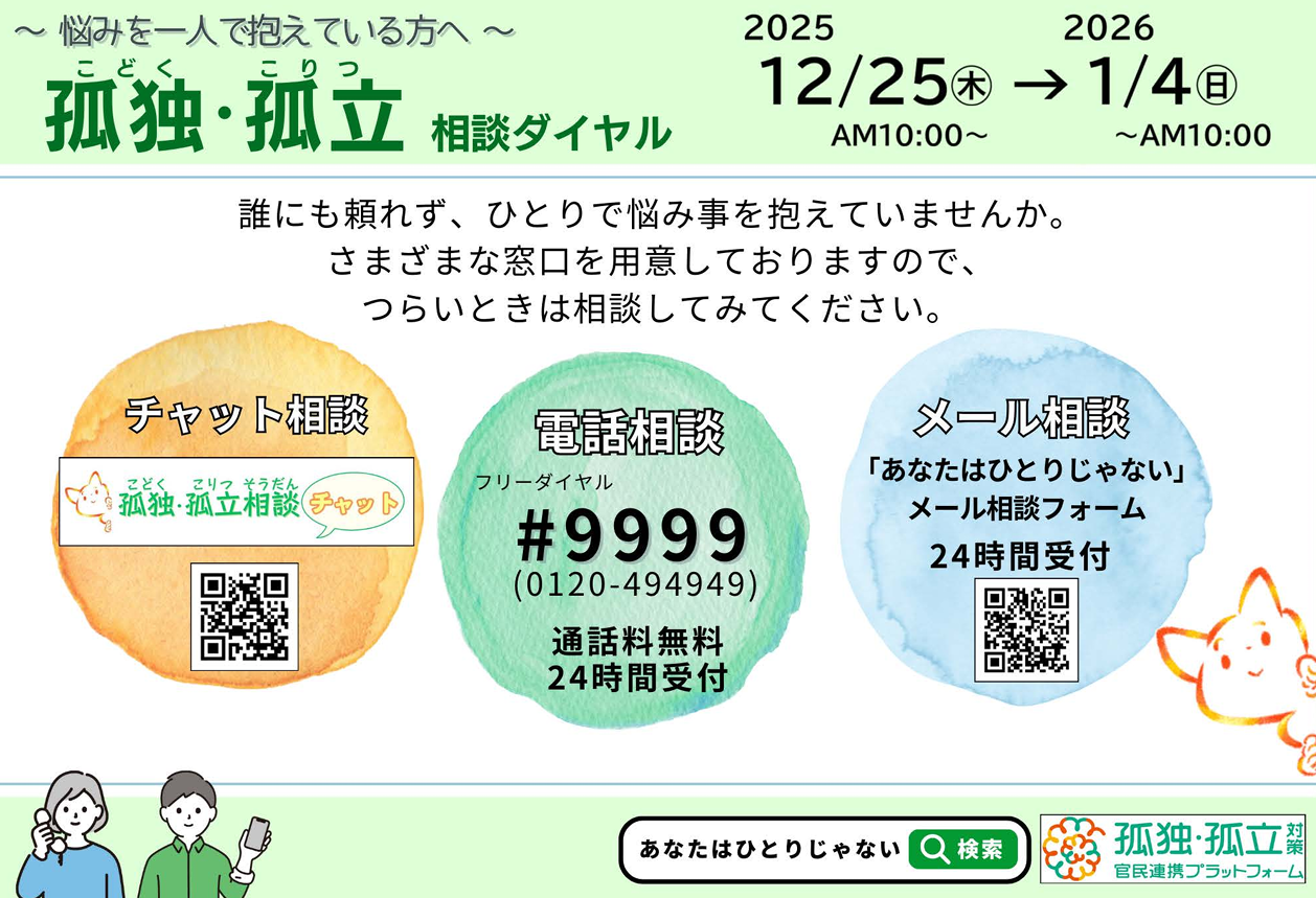 国の方で、年末年始に利用できる「孤独・孤立相談ダイヤル」が設置されております。